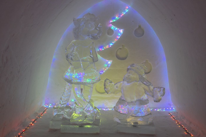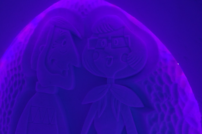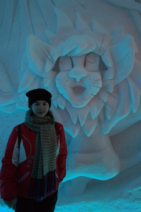 После снегоходов, отправились в «Снежную деревню». В большой куче снега сделаны коридоры в которых установлены ледяные скульптуры, а стены украшены снежными барельефами. В этом году в честь 80-летия «Союзмультфильма» тема деревни герои мультфильмов:
