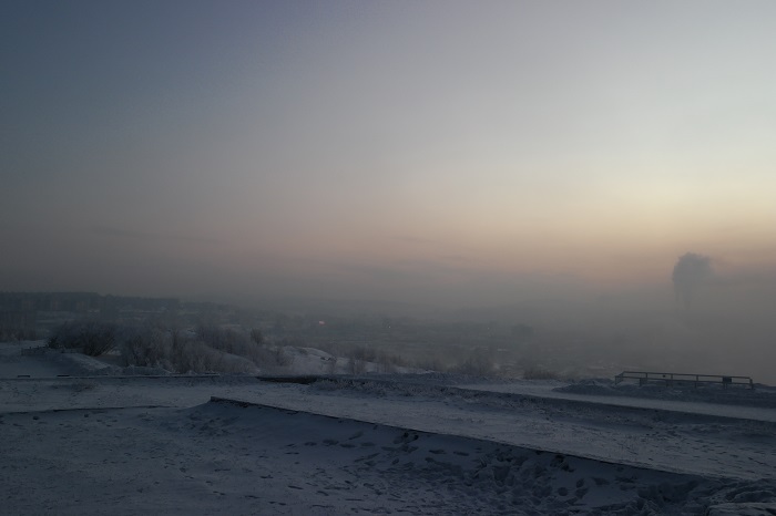 Кольский залив. От воды идёт пар, так что весь город как в тумане: