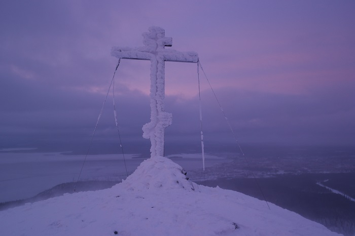 Следующий пункт программы, подъём к поклонному кресту на вершине Крестовой горы, выполнили вдвоём с дочкой, мама позорно дезертировала, сославшись на боязнь высоты. На Крестовой горе находиться горнолыжный комплекс, поэтому подниматься пришлось по краешку горнолыжного спуска длинной 800 метров. Когда поднялись наверх, почувствовал себя как в фильме «Эверест», ветер такой, что до костей пробирает.