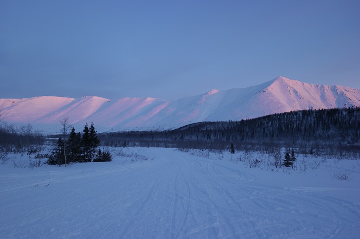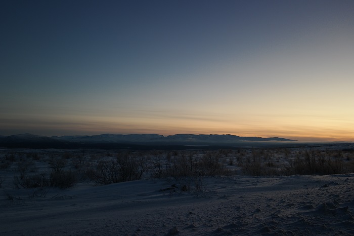Утром 2 января температура в Колвице -7. Я даже подумал, а стоит ли одевать термобельё, но Светлана меня убедила, что обваренных меньше, чем обмороженных и мы отправились на встречу с собачками полностью экипировавшись. Хаски-парк находиться в Ловозерских тундрах 66 км дороги Оленегорк-Ловозеро. Расстояние по дороге 240 км. По прямой, через горы, всего 130 км. По дороге встретили заполярный рассвет: