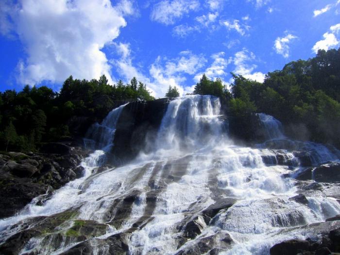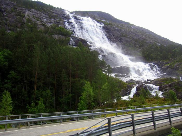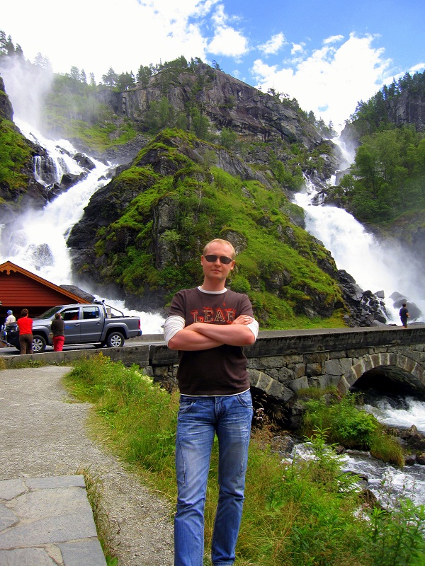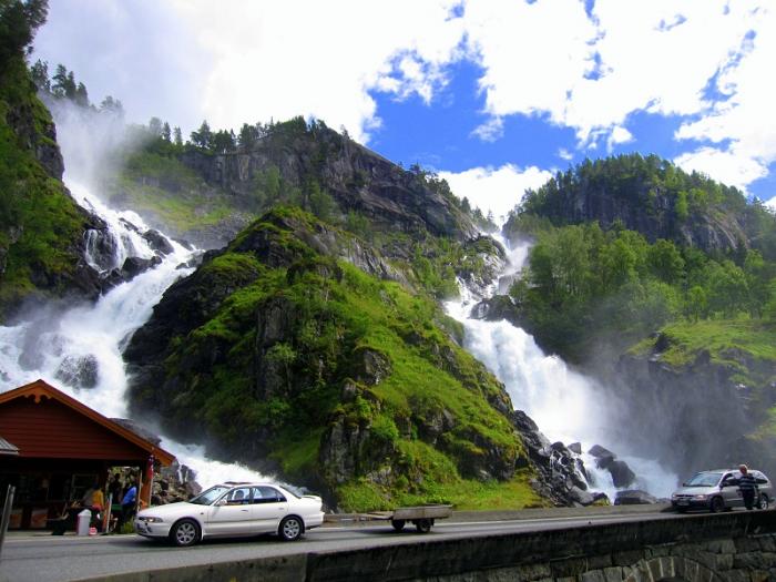 Наконец приезжаем наверно к одному из самых известных — водопад Latefossen. Два потока воды с разных сторон устремляются вниз с высоты 165 метров.