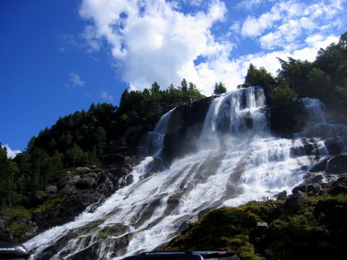 Дело в том, что метров за 200 до водопада находится платный участок дороги. Поэтому только для того, чтобы посмотреть на этот водопад вблизи и сфотографировать придется раскошелиться на 82 кроны (430 руб.) в каждом направлении. Смирившись с неизбежным, развернулись и поехали на действующий ледник Buarbreen. Это третий по величине действующий ледник в Норвегии.