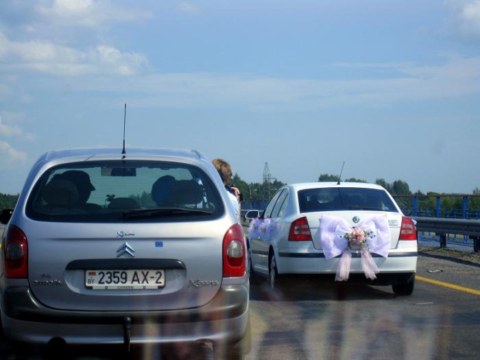 После Витебска встречаем свадьбу. Наши поздравления молодым. Оператор из машины слева чуть не вывалился из окна, снимая жениха и невесту.