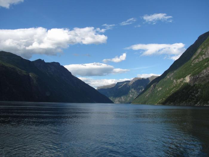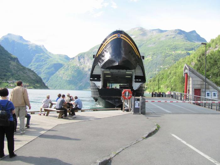Оказалось, что мы пропустили поворот на Далснибба, самую большую здесь вершину с обзорной площадкой. Жаль… Пошел серпантин! И вдруг с обзорной площадки мы увидели наш первый фьорд, который вообще считается самым красивым фьордом. Просто потрясающе! Съехав к нему, мы узнали, что успели на паром, он в 17 часов. Еще при планировании маршрута мы собирались прокатиться по Гейрангеру на пароме. Успели пообедать на берегу. Очень прикольно есть помидоры и огурцы,, которые проехали с нами 3 тыс. километров! Подошел паром, при причаливании у него открывается нос, и он становится похож на большую акулу, который сейчас заглотит причал вместе с машинками.