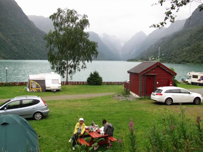16.07.10 Встали в 8:10, позавтракали, собрались. Где в 10:30 выехали в сторону Трондхейма по Е6 Но через 90 км мы с нее ушли, потому что в этот раз в Тронхейм мы заезжать не собирались, наша цель — ледник Юстельдальсбреен (Jostedalsbreen). Поэтому мы поехали по дороге с номером 15. За бортом 18 градусов, но уже показались горы со снегом! Постоянно с гор стекают водопады, виды очень красивые. На каждом шагу кемпинги.