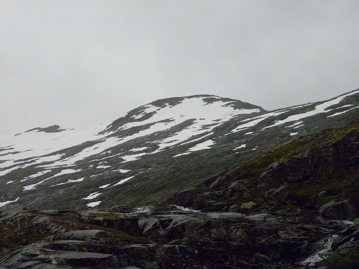 За Stryn’ом путь некоторое время лежал по трассе 15, пока навигатор не предложил переместиться на дорогу 63. Начали подниматься в гору. Температура за бортом (которая и до этого была не слишком высокой – 15-16 градусов) стала стремительно падать. По обочинам появился снег. Мы достигли т.н. «Дороги Орлов».