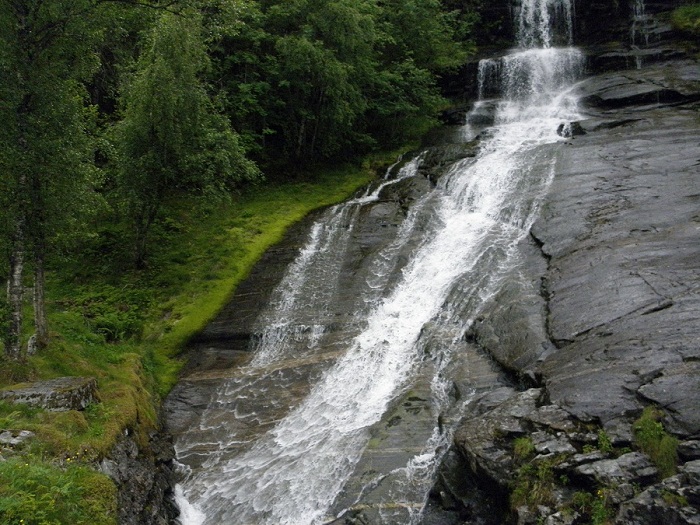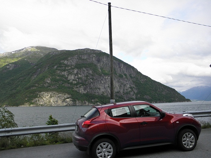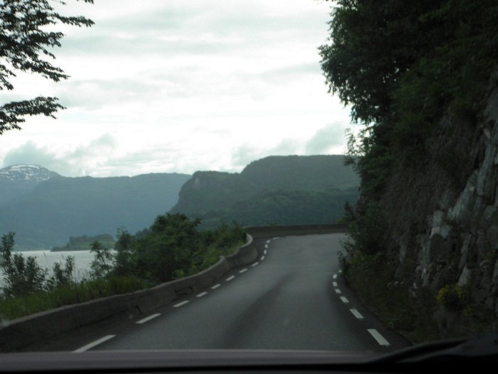 До Бергена оставалось меньше 150 км – по маршруту, который предложил навигатор. Но, глядя на карту, мы поняли, что не простим себе, если не проедем по берегу Хардангер-фьорда. Это крюк в 50 км, но он однозначно стоил потраченного времени и бензина! Остроту ощущениям добавляла дорога, которая от Granvin’a до Norheimsund’a представляла собой 1,5 полосы в ширину, иногда сужаясь до 1 полосы, с «карманами» для встречных разъездов и резкими «слепыми» поворотами. Несмотря на это (а может быть как раз благодаря этому) дорога оказалась платной, со знакомыми нам уже камерами AutoPASS.