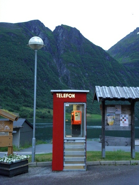 Добраться до Bjørke тоже оказалось непросто: навигатор не знал, что полгода назад туда прорыли какой-то хитрый тоннель, и повёл нас совсем уже просёлочными дорожками среди лесов, озёр и горных перевалов. А сама деревня расположилась в такой норвежской глуши, что даже мобильная связь здесь была явлением непостоянным. В связи с чем обитатели сохранили в рабочем состоянии старенький телефон-автомат.