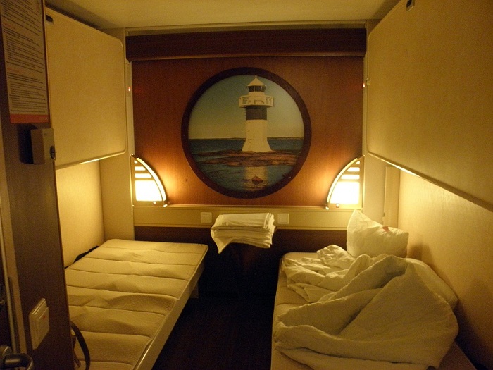 На паром погрузились быстро и без проблем. С размещением в каюте пришлось подождать: уборка после ночного рейса производится одновременно с посадкой пассажиров. Каюта, хотя и без окна, но очень уютная, с собственным санузлом. Прогулялись по верхней открытой палубе, попили чаю и легли спать.