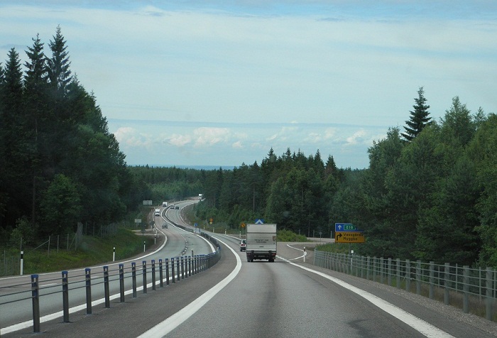 Шведский ландшафт вдоль трассы Е18 ничем не отличается от среднестатистического карельского. Такое чувство, что едешь по Ленобласти, только дороги лучше. Кстати, что интересно, встречные потоки разделены отбойником даже там, где полосы всего две. Никаких обгонов по встречке. Для опережения тихоходов периодически на 1-2 км появляется дополнительная полоса. Но так, конечно, в Швеции не везде…