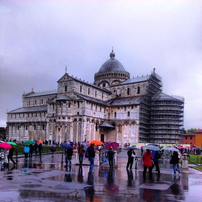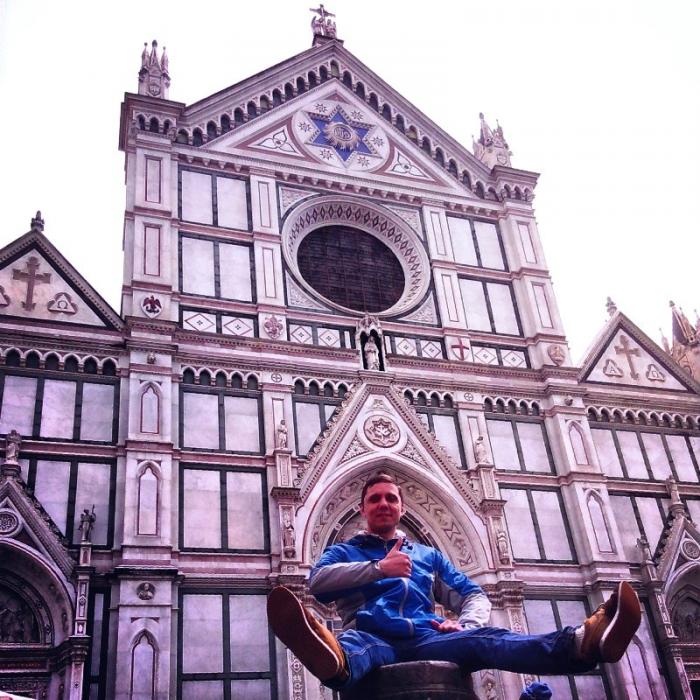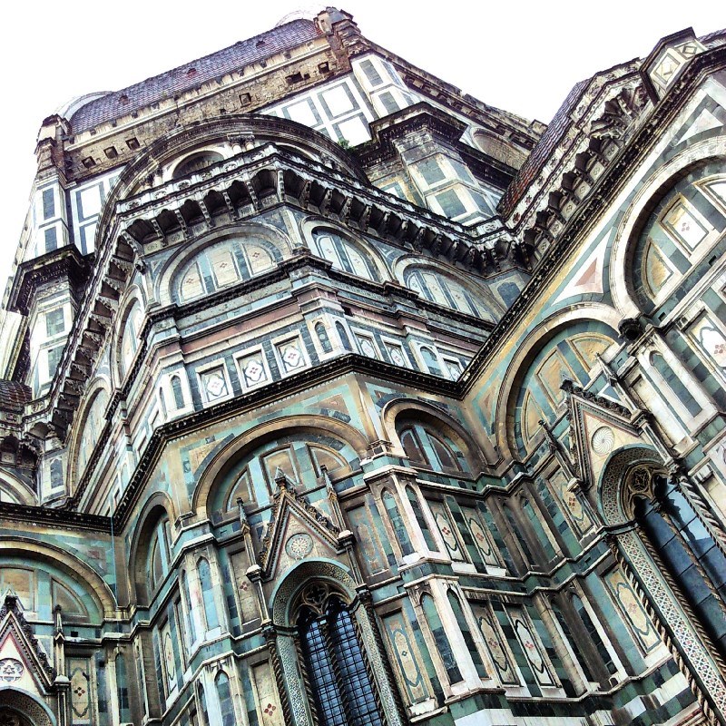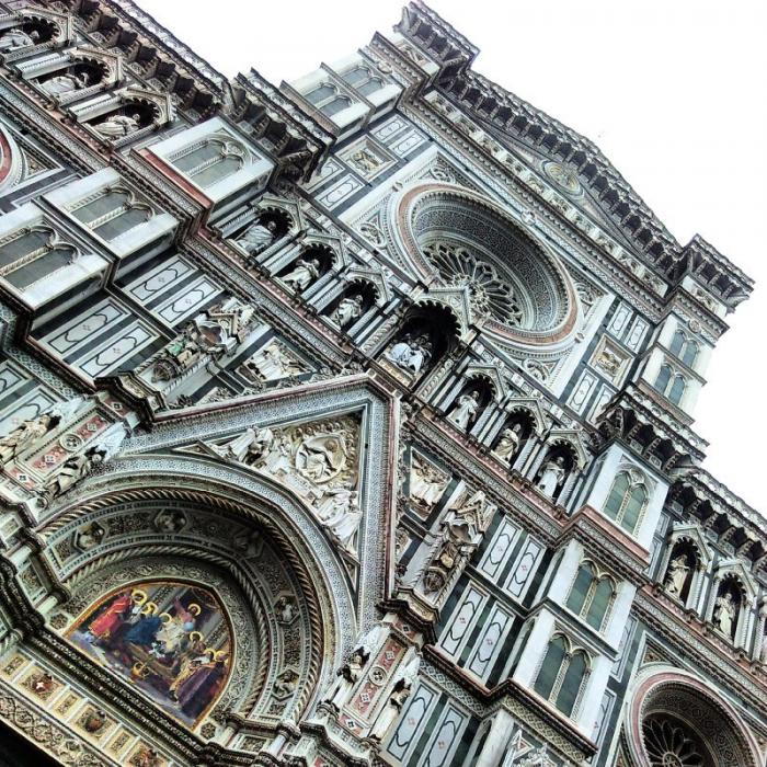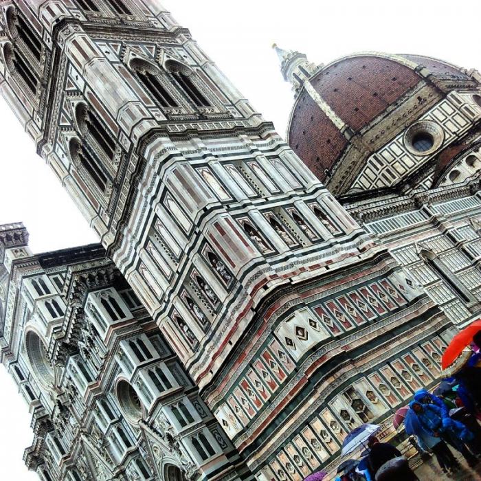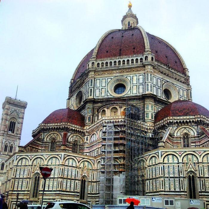 Кафедральный собор (Дуомо) — главная достопримечательность Флоренции. Это четвертая по величине церковь в мире после римского Святого Петра, Святого Павла в Лондоне и Дуомо в Милане, и величина и грандиозность его такова, что целиком в объектив фотокамеры он ни под каким углом не помещается, хоть ложитесь на землю. Купол собора, спроектированный знаменитым итальянским архитектором Филиппо Брунеллески, до недавнего времени считался самым большим на планете: высота его — 42 метра, вес — около 40 тысяч тонн, а кирпичей в его конструкции — более 4 миллионов!