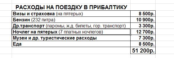 Бензин в России заправляли 92-й, 26-27 руб/литр. В Прибалтике не видели его ни на одной заправке, использовали 95-й. В Эстонии (на острове Сааремаа) он стоил 1.34 евро/литр или примерно 53 рубля по тому курсу. В Латвии: 0.96-0,98 лат / литр, т.е. около 55 рублей. В Литве цена за литр была 4.8-4.9 лит, что составляет приблизительно 56 рублей. Была мысль взять с собой из России 10-литровую канистру, но мы от нее отказались. Заправок в Прибалтике хватает, экономия на 10 литрах — рублей 300, зато большой шанс дышать бензиновыми парами всю поездку (особенно с нашей ненадежной пластиковой канистрой). На 3030 километров в пути мы потратили 232 литра горючего. Так что средний расход был 7.6 литра на сотню — очень неплохо, с учетом городов, нескольких серьезных пробок и строгих ограничений скорости в нац. парках.
