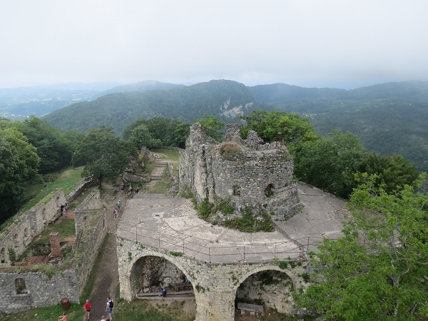 От парковки Новоафонской пещеры нужно проехать еще около 2 км. Наверху имеется своя небольшая парковка (43 05.576’, 040 48.159’), стоимостью опять-таки 150 рублей. Но и от нее придется прилично топать в гору по извилистой лесной дорожке, огибая руины крепостных стен и любуясь открывающимися панорамными видами. Не забудьте в кассе рядом с парковкой приобрести билеты в Национальный Новоафонский историко-культурный заповедник «Анакопия» по 150 (загадочная цифра Абхазии) рублей за человека и вперед к цели – Анакопийской крепости, которая возвышается на 350 м над уровнем моря, а потому является не только интересным историческим памятником, но и превосходной смотровой площадкой.
