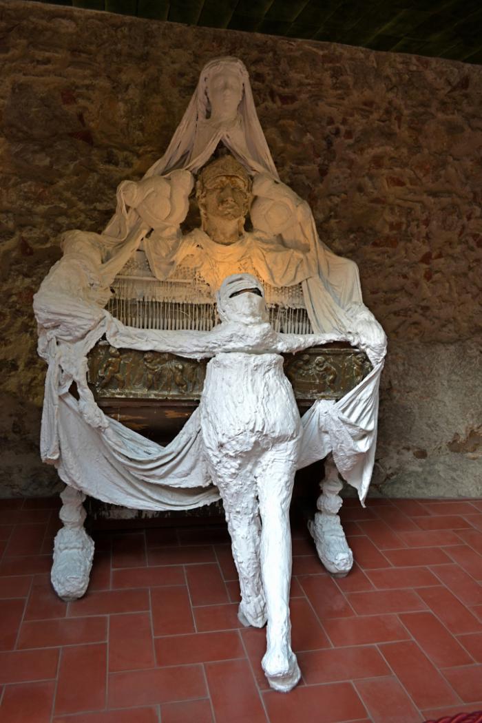 Из вестибюля сразу попадаешь во двор-сад. На этом месте раньше располагался партер муниципального театра, здание которого и было переделано в музей. Всем вниманием сразу завладевает инсталляция в центре