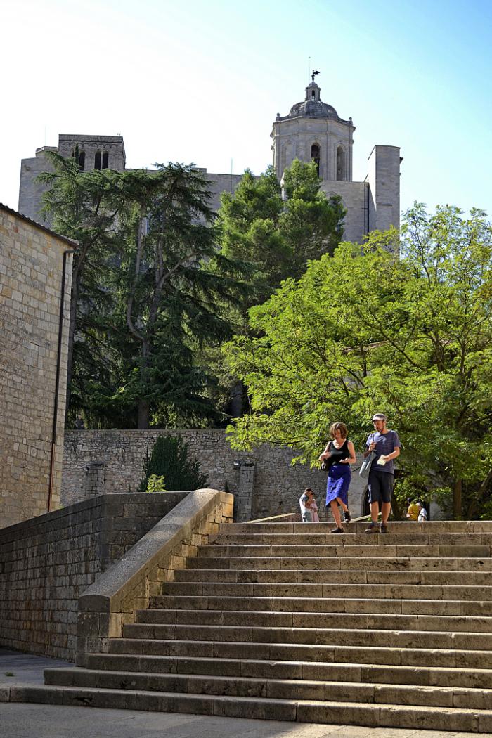 Следуя дальнейшим указаниям аудиогида, я прошла в направлении городской стены, являющейся частью старинной фортификационной системы. В месте подъема на стену находится замечательная видовая площадка, на которую я, конечно же, забралась и полюбовалась великолепными видами. С площадки открывается обзор и на старый город, и на современную его часть. А доминируют надо всем этим великолепием колокольниКафедрального собора Жироны с узнаваемой фигуркой-флюгером, прозванной Ангелом собора, и базилики Святого Феликса.