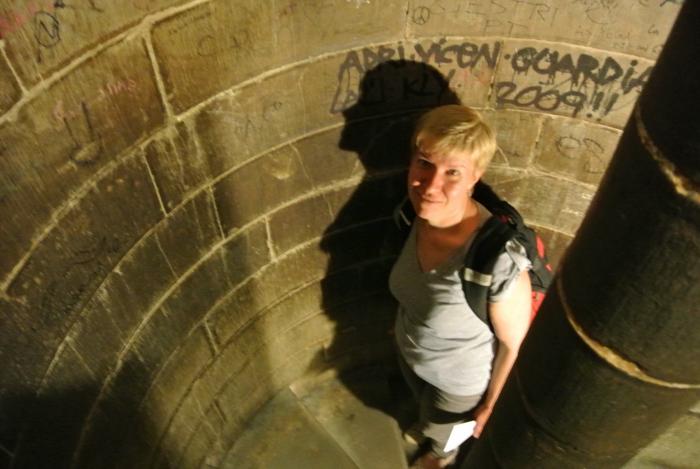 Очень красивый вид! Нагроможденье домов, покрытых черепицей терракотового цвета, видны практически все архитектурные памятники. Но в целом город показался весь песочного оттенка, какой — то монохромный. Может быть, поэтому его Соборы и смотрятся очень нарядно на фоне одноцветных домов. Спускаясь вниз, ещё раз получили возможность полюбоваться этим чудом архитектуры изнутри.