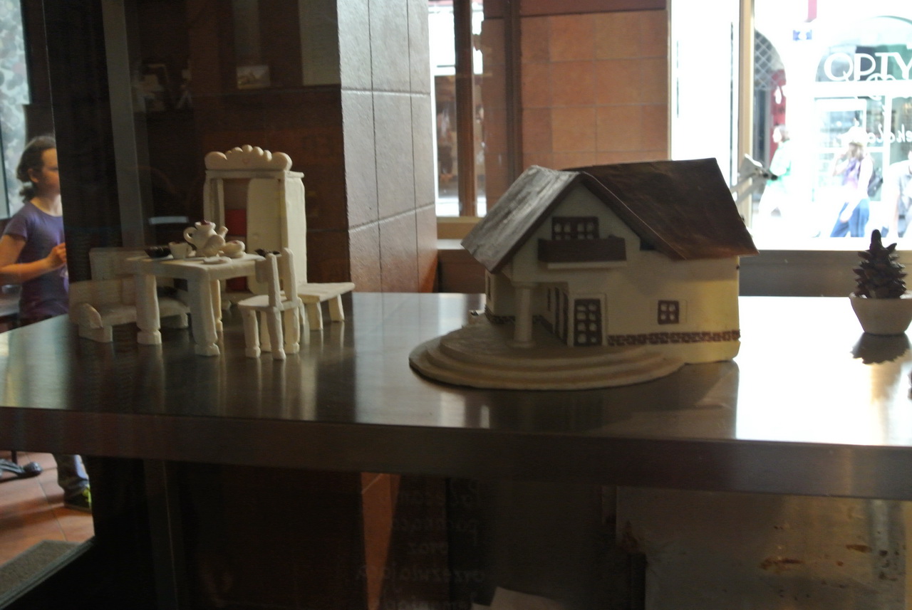 При выходе из Королевского замка зашли в ресторан украинской кухни и очень вкусно пообедали. На обратном пути осмотрели Барбакан, бывший когда-то главным оборонительным сооружением города. На рыночной площади обнаружили магазин рок-атрибутики, купили детям футболки. Потом наткнулись на шоколадный магазин, поглазели на всякие фигурки из шоколада.