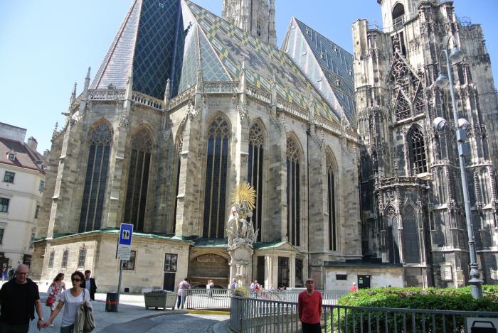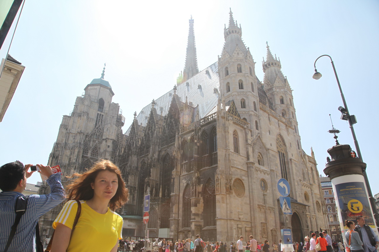 28.04.2013. воскресенье Подъём, завтрак и в Вену. По автобану добрались быстро. Хочется отметить, что город устроен (если можно так выразиться) очень рационально. На конечных станциях метро располагаются огромные парковки, где можно оставить железного коня за 3 евро в сутки. Рядом вход в стацию метро. Поезда небольшие, ходят строго по расписанию, до центра мы добрались за 20 минут. Вена считается одним из красивейших городов мира и полностью оправдывает это определение, а её исторический центр, Иннере-Штадт, внесен в Список Всемирного культурного наследия ЮНЕСКО. Мы гуляли по старой исторической части города, любовались дворцами и соборами. Символ города – Собор Святого Стефана, напротив него одноимённая площадь – Stephansplatz. Собор выполнен очень ажурно, поэтому, несмотря на свою массивность, выглядит как кружевной. Вообще в Вене все дворцы, словно сотканы из кружевного полотна.