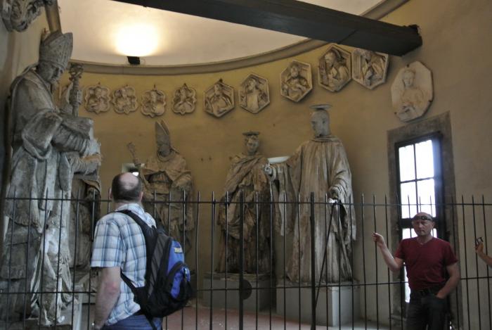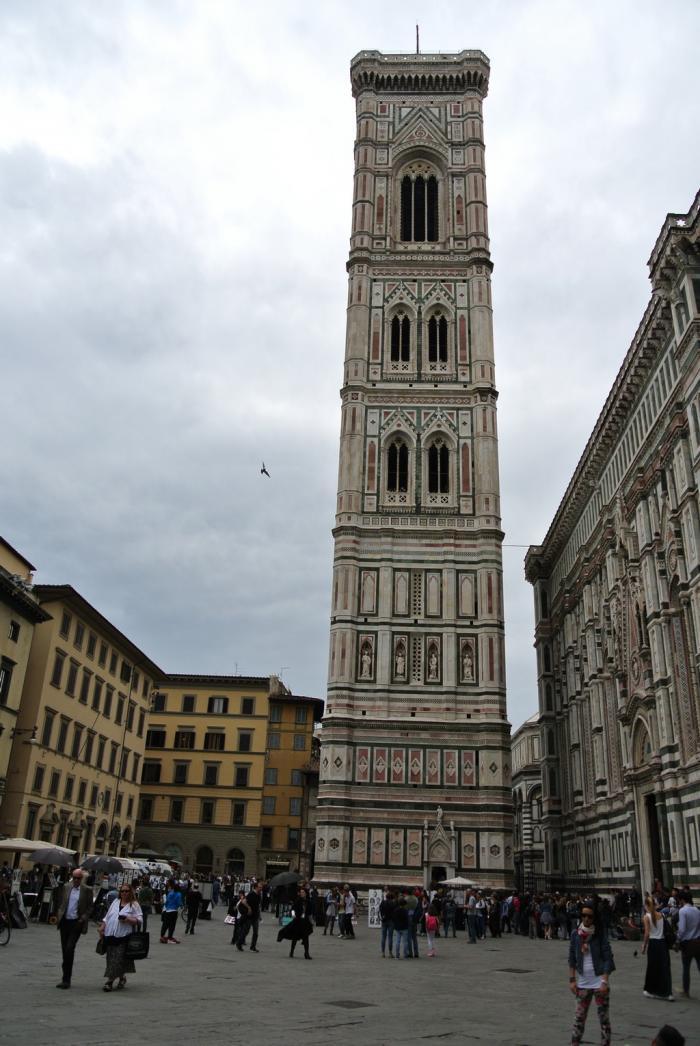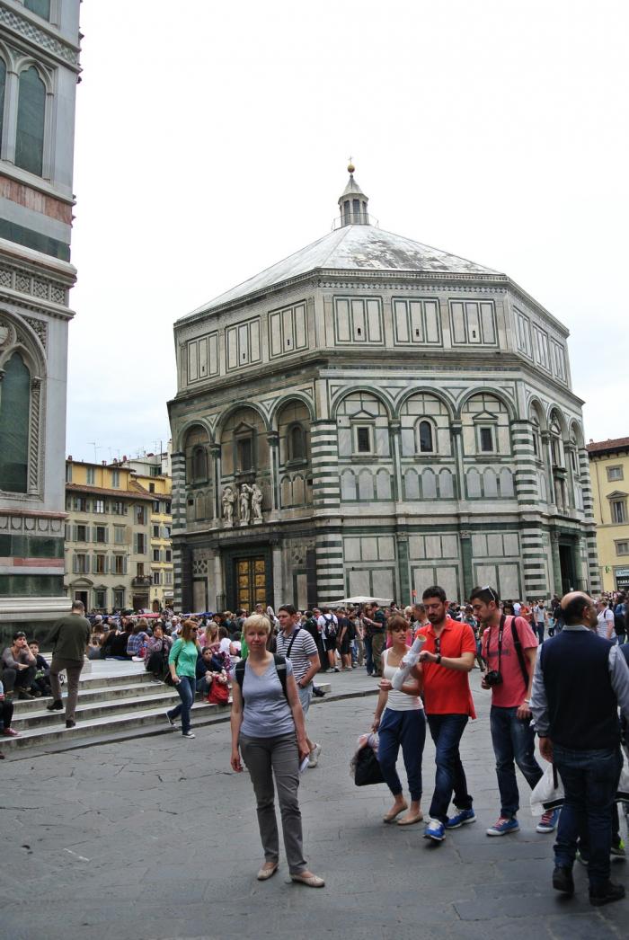 До центра от вокзала минут 15-20 ходьбы и вот мы уже около Дуомо Флоренции – Собора Санта-Мария-дель-Фьоре. Собор является четвёртой по величине церковью в мире. Снаружи он облицован разноцветным мрамором и напоминает шкатулку для драгоценностей. Длина собора 130 метров, ширина 90 метров и высота тоже 90 м. По задумке авторов он должен был вмещать всё население города. (В то время 90 000 человек – интересно правда ли они там помещались или это всё-таки из категории легенд?). Венчает Собор огромный купол. Вход в Собор свободный, там проводятся бесплатные экскурсии. Мы решили подняться на смотровую площадку на куполе, что бы полюбоваться панорамой города. Пока стояли в очереди за билетами, читали информацию о строительстве этого чуда архитектуры. Оказывается, финансовую помощь при строительстве оказали Уральские промышленники Демидовы, поэтому на фасаде Дуомо выбит их фамильный герб. Как этот герб выглядит, мы не знаем, поэтому его и не нашли. Потом обратили внимание на часы над входом. Они имеют 24-часовой циферблат и их стрелки движутся в обратную сторону. Поднимаясь на купол, мы сначала очутились в небольшой комнате, где был Музей строительства Собора. А двигаясь дальше, вышли на балкон, с которого прекрасно просматривается всё внутреннее убранство собора. Потом ступеньки стали круче, проходы сузились и местами возникали пробки из поднимающихся и спускающихся туристов. Вот мы уже на самом верху, и вся Флоренция перед нами, как на ладони.