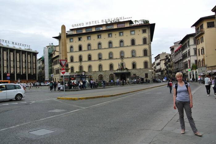 Начнём с пробега – на сегодня он составил 320 км. Итак, Флоренция – колыбель Возрождения. Заселившись в отель, расспросили портье, как проехать в центр. Booking не соврал, автобусная остановка была напротив нашего «Indicatore». Далее выяснилось, что сегодня праздник – День освобождения, поэтому портье любезно предупредил нас, что общественный транспорт заканчивает работу раньше, чем в обычные дни. Кроме того, поздно ходить по улицам опасно (мы не поняли – именно в этот день или в любой праздничный, или вообще в любой?). Билет на автобус купили в кафе, рядом с остановкой. Интересно, что один билет на четверых, прокомпостировали его с четырёх углов и поехали. А вот далее Booking соврал, так как ехали до центра не обещанные им 20 минут, а все 40. Но в автобусе, услышав русскую речь, к нам обратилась женщина, приехавшая с Западной Украины. Здесь она работает сиделкой уже около 10 лет. Видимо, ностальгия сыграла свою роль, потому что мы всю дорогу мило беседовали, так, что 40 минут пути пролетели незаметно. Конечная остановка автобуса была у железнодорожного вокзала, который послужил отправной точкой на пути в центр города и ориентиром на обратном пути. Наша попутчица указала нам направление движения и немного проводила нас.