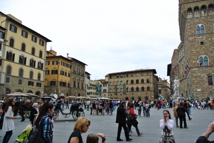 Потом бродили по центру, дошли до Понте Веккьо – мы его знали по открыткам и рисунку в учебнике Истории Средних веков. Потом очутились около Палаццо Питти, присели на одноимённой площади и, пока наши юные друзья фотографировались с разных ракурсов, мы пили чай. А вообще, мне показалось, что центр Флоренции похож на Площадь чудес в Пизе, но все сооружения больших размеров.