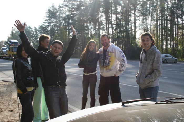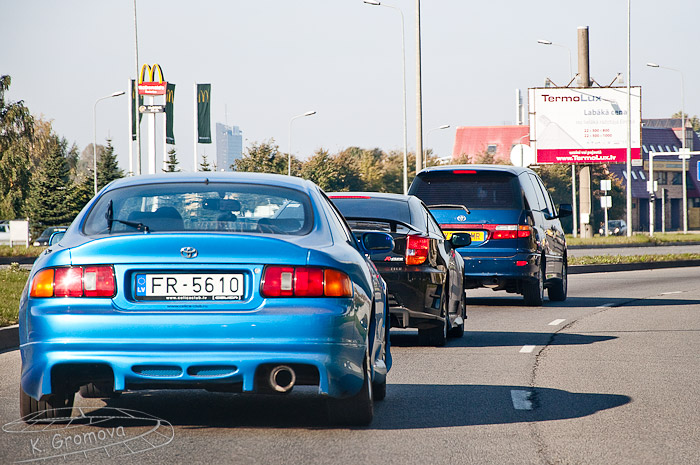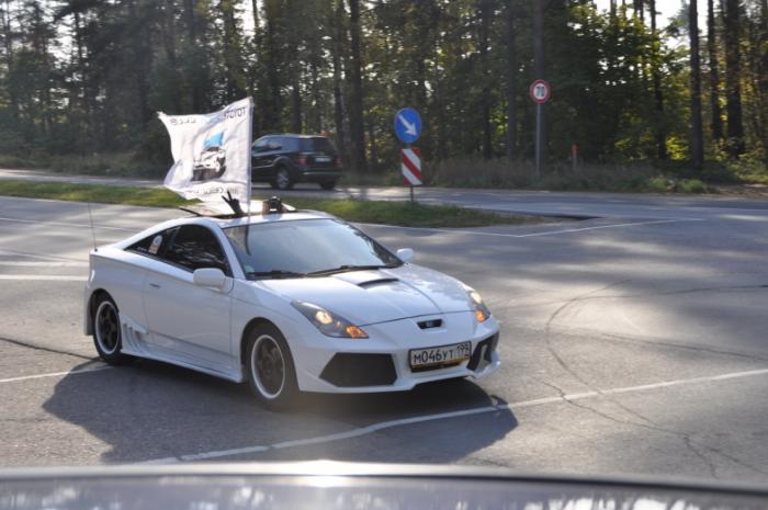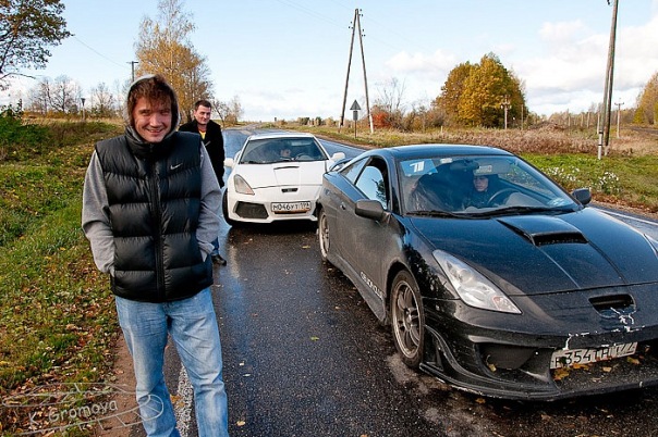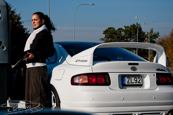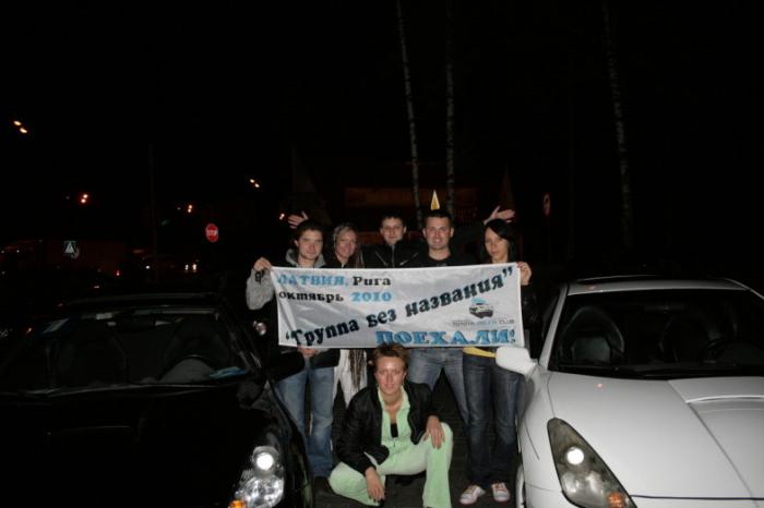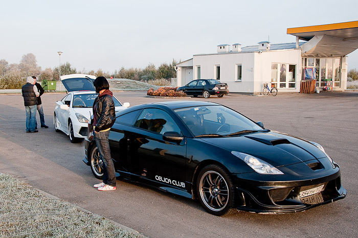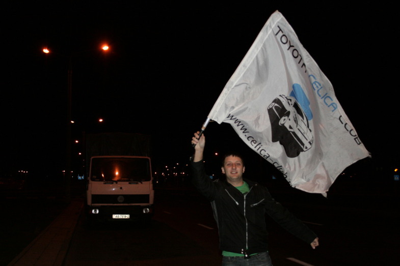 Далее официальная часть нашего приветствия в исполнении экипажей celica-club.ru и стрип-представление для celicaclub.lv, ибо их традиция – это нифига не фотка в красных труселях. Это стриптиз не смотря на время года и погоду. По очереди раздеваемся и одеваем на себя майки с логотипом celicaclub.lv. Скажу честно – было холодно, но грело внимание со стороны «хозяев поля». Теперь мы официально прокачаны и приняты в братство латышских селикаводов. Далее познакомили друзей-латышей с российским гимном клуба, который им очень понравился и теперь они его качают и слушают, а так же выгуляли флаг и гимн дружественного R-club’а.