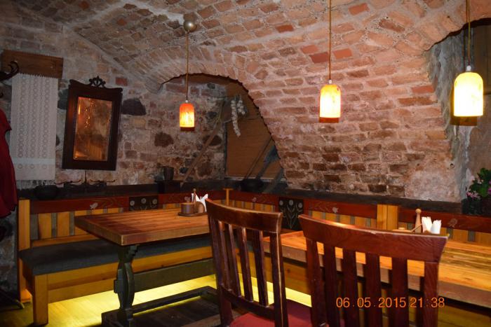 Ужинать пошли в ресторан литовской кухни «Forto dvaras», что на улице Пилес, 16. От наших апартаментов до него две минуты пешего хода. Несколько залов ресторана находятся на первом этаже, есть открытая веранда на улице.
