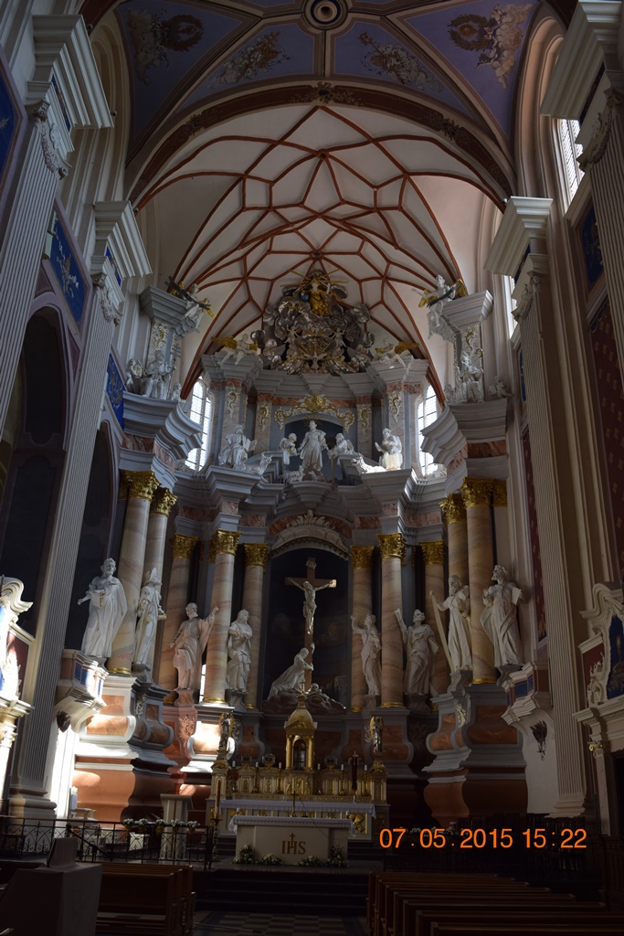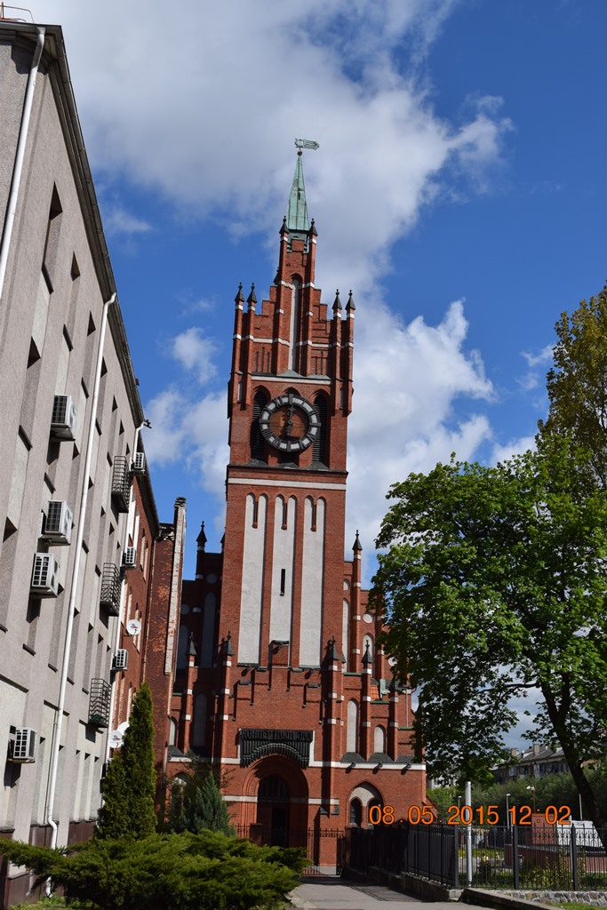 Если встать спиной к ратуше, то над левым углом площади можно увидеть башню католического Собора Святых Петра и Павла. Сфотографировать близко этот хорам очень сложно, потому что он окружён узкими улицами.