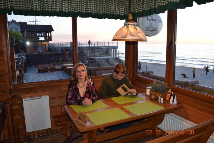 Здесь же, на пляже, рекомендованный нашей хозяйкой ресторан «АмБар». Зашли на разведку, разведданные нас устроили: меню хорошее, цены адекватные и всё это с видом на море. На вечер заказали стол у окна, что бы за ужином полюбоваться закатом.