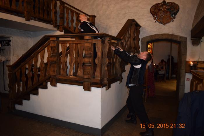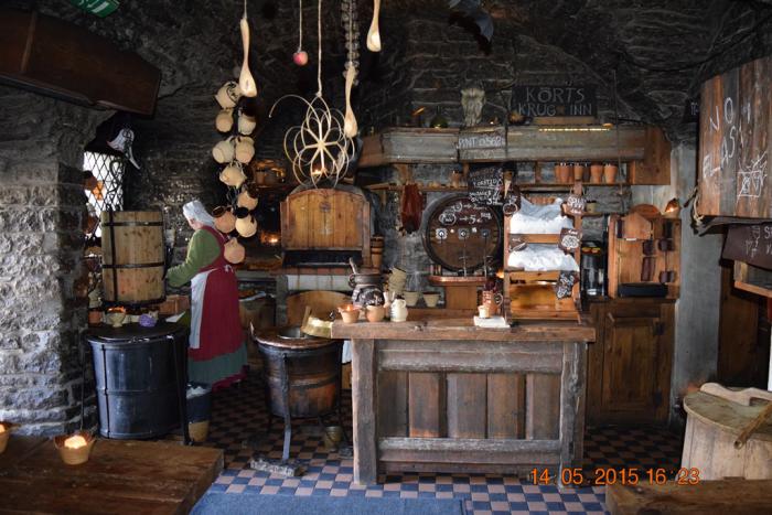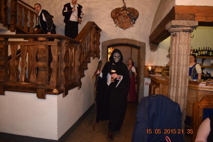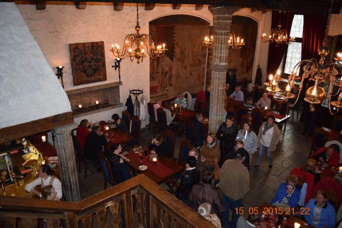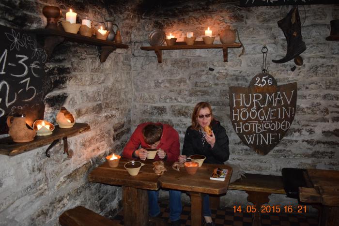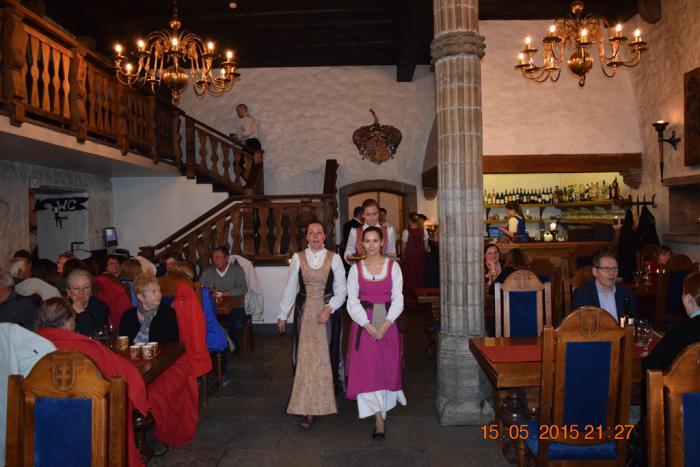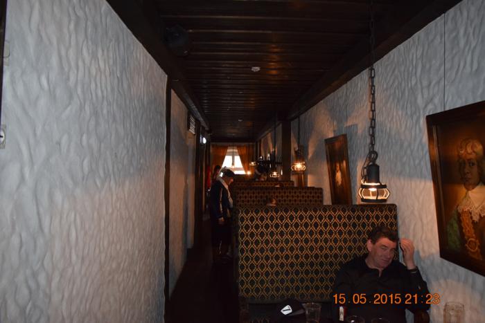 Безусловно, заведение рассчитано на туристов, но ведь мы помним, зданию этому более 600 лет, что уже создаёт атмосферу. И обстановку здесь пытаются создать средневековую и блюда самые простецкие суп-похлёбка, жареные колбаски и разнообразные пирожки. Из напитков пиво, сидр и морс. И очень аутентичная хозяйка,