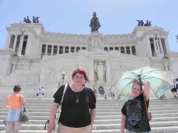 Выходим на площадь Венеции. И тут Оля произносит фразу – «Рим – это сказочный город, построенный гигантами», эта фраза ложится в путевой журнал итогом дня. Настолько поражает её памятник Виктору Эммануилу II. Проект был разработан Джузеппе Саккони в ампирном духе древнеримской архитектуры. Частью монумента является двенадцатиметровая бронзовая конная статуя короля. Под ней находится могила Неизвестного солдата, так называемый «Алтарь Отечества». В Витториано располагаются два музея: Рисорджименто и знамён военного флота. Памятник выделяется среди прочих римских зданий, поэтому среди римлян распространены различные снисходительно-презрительные наименования монумента: «Пишущая машинка», «Свадебный торт», «Вставная челюсть» и другие.