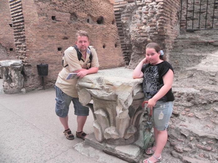 Утром, пока готовили завтрак, дождик всё же взбрызнул, напугав нас плохой погодой. Пришлось взять зонтики, они нам потом очень пригодились – не от дождя, а от палящего солнца! От кемпинга до станции электрички в Рим нас доставил бесплатно кемпинговый автобус, которым управлял бывший наш соотечественник по СССР молдаванин Василий, который с удовольствием рассказал, что, где и как. Заодно и я расспросил его о том, как он попал сюда. Оказалась очень интересная история. Подробно, не одну страницу надо, но в двух словах так: бежал 10 лет назад из нищей Молдавии. Спустя много лет получил итальянский паспорт благодаря своему упорному труду на хозяина. Мечтает заработать итальянскую пенсию, но жить в Италии не хочет, потому, что эмигрант и относятся к таким плохо, а на итальянскую пенсию будет сказочно жить, когда вернётся в Молдавию. Практически всю зарплату пересылает семье, дочь на его деньги получает высшее образование, жена построила хороший дом, а Василий, заплатив 1000 евро пограничникам, купил «окно» на границе для сына, который вплавь переплыл Дунай. И сейчас тоже начинает жизнь нелегалом в Италии. Вот так вкратце. История очень интересная и большая.