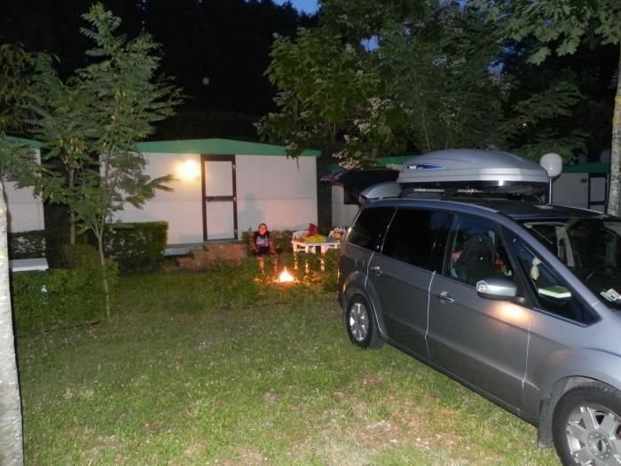 И опять навигатор нас не подвёл, подкатили прямо к рецепшену кемпинга. Из-за начинавшихся сумерек и пасмурного неба палатку решено было не ставить – взяли в аренду милый трёхместный домик – с душем, умывальником за 138 евро! Однако, за две ночи дороговато, но что поделать — Рим! На смеси русского-итальянского-немецкого-английского разузнали, как утром добраться до Рима. Домик с очень уютным двориком, расположившийся в ряду таких же, но пустовавших. Ужин под огромным цветущим каштаном, и зарево огней Рима вдалеке! Раскаты грома где-то не очень далеко, но дождь до нас так и не дошёл. Красота.