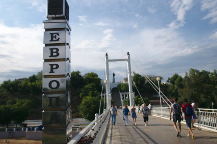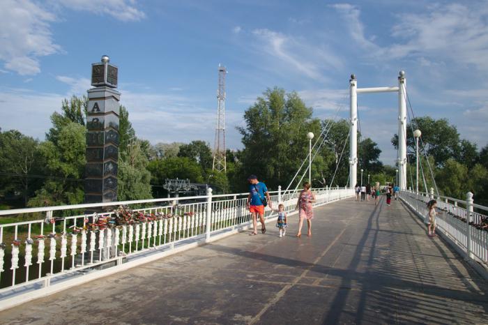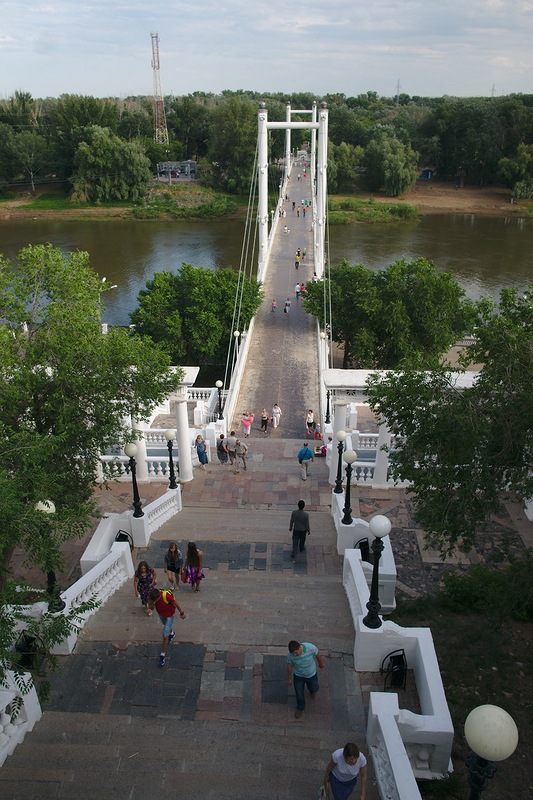 От памятника к Уралу спускается лестница, ведущая на главный туристический аттракцион города — мост из Европы в Азию.