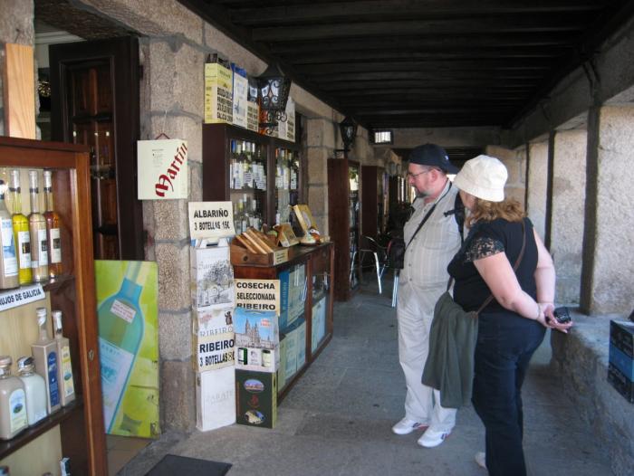 Только в кафешках сидят немногочисленные испанцы и пьют различные напитки. Магазинчики, как правило, закрыты, за исключением винных лавок, которых здесь множество. Продают в основном вина Albarinos, Ribeiros различных сортов по цене от 8 до 18 евро за три бутылки. Также стоят в витринах различные ликеры Галисии.