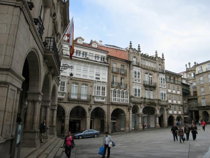 Через пару кварталов нашей совместной неспешной прогулки мы разделились для самостоятельного продолжения экскурсии. Разделение на группы по интересам — наиболее приемлемый способ достижения консенсуса между двумя парами, разно ориентированными на постижение прекрасного. Чинины, в моем представлении, нацелены на результат. Вовка вообще склонен к излишнему рационализму, прорисовке схемы движения по городу, составлению каталога фотографий. Меня поражает его работоспособность в стремлении познать окружающие достопримечательности и запечатлеть их на фото. Но, честно признаюсь, в результате его фотографии намного превосходят мои. Мы же с Леной более склонны бесцельно бродить по улочкам, не особо задумываясь, с какого ракурса заснять то или иное здание. Также, не торопясь, мы бродили по улочкам Оренсе, смотрели на здания, на людей. Погода не баловала, то и дело срывался дождик.