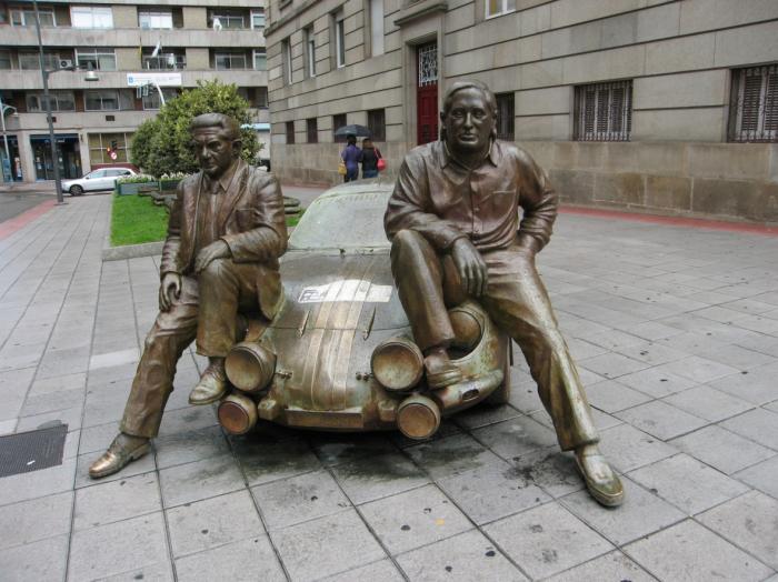 Не спеша прогуливаясь по улицам, незаметно вышли за условную границу старого города и оказались в небольшом парке Parqoue de San Lazaro. Здесь дышали воздухом симпатично одетые подтянутые старички, старушки с внуками, а также молодые мамаши и папаши с детьми. Из достопримечательностей обнаружили бронзовую скульптурную композицию: два полноразмерных мужчины сидят на капоте миниатюрного автомобиля типа немецкого VW-жука с номерным знаком OR-24881 и с надписью на ветровом стекле 1967-ESCUDERIA. Зашли в кафе, где угостились вкуснейшим мороженым. В магазине купили кусочек хамона ( сыровяленый свиной окорок), который был одной из целей нашего путешествия в Испанию.