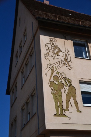 Фреска на одном из домов в непосредственной близости от замка рассказывает легенду о рыцаре-разбойнике (именно так: через дефис) Эппеляйне: он махнул через тридцатиметровый крепостной ров, спасаясь от преследования справедливо возмущенных его разбойничьей деятельностью горожан, да так, что остались отпечатки лошадиных копыт на каменной кладке. Впрочем, как мстительно замечает путеводитель, его все равно колесовали. В 1381 году. В Ноймаркте. Ибо не фиг.