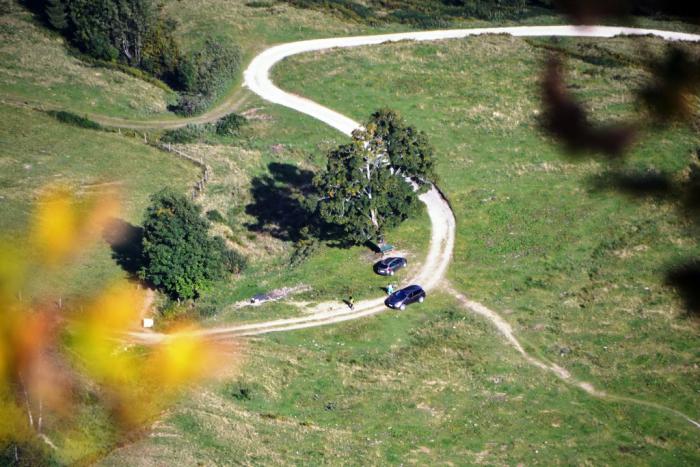 Тропа сначала шла строго по хребту, и в какой-то момент мы даже увидели оставленную внизу собственную машину.