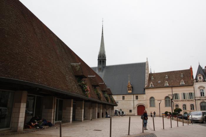 В Бон мы приехали в 16-30. Пасмурно, моросит дождь. Пристроили машины на бесплатной автостоянке недалеко от центра. Неподалеку от стоянки большой туристический центр с обширной информацией о городе и о Франции. Прошли сквозь него и вскоре вышли на рыночную площадь. Гуляющих довольно много, несмотря на плохую погоду. Вначале мы ходили все вместе, потом у собора Нотр Дам потеряли Галину (она нашлась позже на рыночной площади у карусели), после этого разделились на две части. Городок симпатичный, чистенький, со множеством магазинов и кафе. Много старинных зданий, аккуратно отремонтированных. Во двор госпиталя «Les Hospices de Beaune» мы зашли с задней стороны, полюбовались разноцветной черепичной крышей, погуляли по красивому ухоженному садику.
