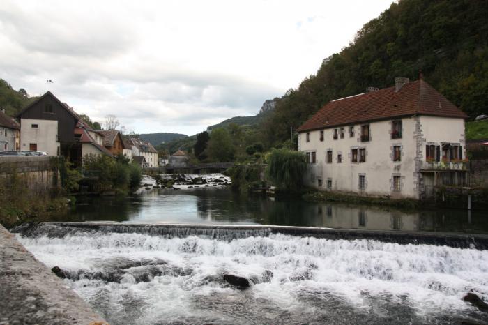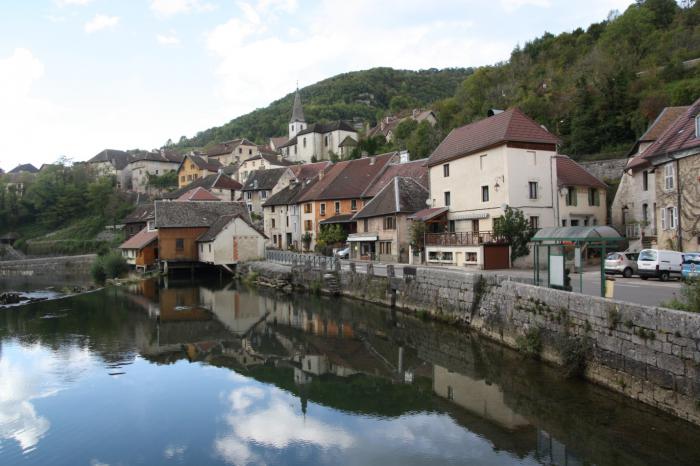 Самый дальний пункт нашей сегодняшней поездки – крепость ЖУ (Chateau de Joux), расположенная в 50 км южнее Безансона. Живописная дорога идет по почти гористой местности с крутыми поворотами, глубокими ущельями, спусками-подъемами. В пути остановились для фотосъемок в очаровательной деревушке Vuillafans, лежащей вдоль шоссе по обеим сторонам быстро бегущей горной речушки. Река в трех местах в пределах деревни перегорожена каменными дамбами с красиво падающими струями воды. В воде плавают большущие рыбины, и ни одного рыбака.