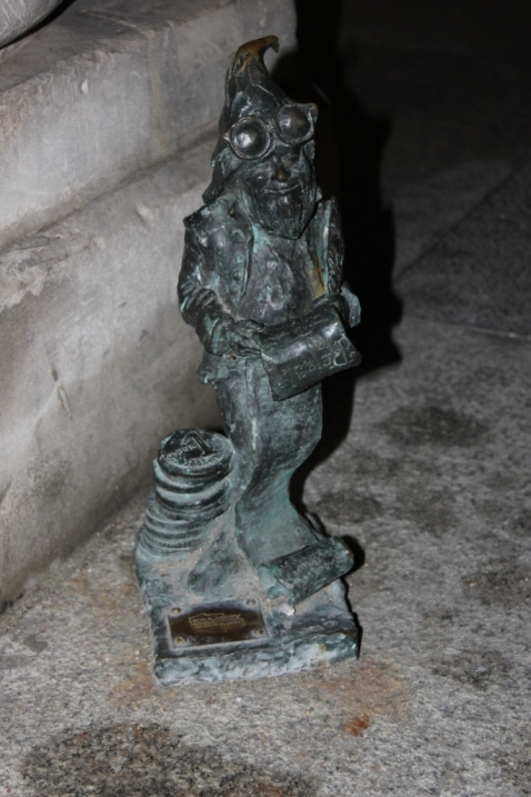 Фигурки эти сделаны вроде из бронзы. Высотой сантиметров 30-40 — рост гномов. Кто поставил первого и зачем – мне было не ясно. Но с каждым годом, говорят, их все больше — что их уже почти сотня. Какой-либо системы в установке мы не нашли. Они могут быть где угодно. Некоторые в укромных уголках, некоторые почти на проходе.