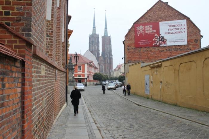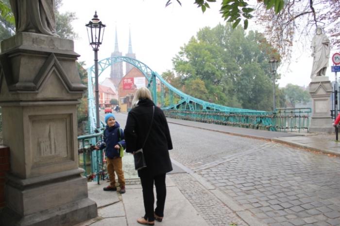 На следующее утро на город пал туман. Туман и сырость. От вчерашнего раздолья природы не осталось и следа. Быстренько порубав купленных продуктов, мы двинулись на Тумский отстров, откуда есть пошла земля Вроцлавская. Улицы в общем были «с народом». Но вот перед входом на Железный мост было пусто.