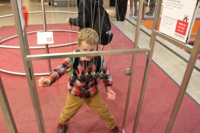 То тут, то там были расставлены забавные и занятные экспонаты, демонстрирующие все желающим элементарные законы физики. Это и лента Мёбиуса в виде дороги и магнитного автомобильчика, и стеклянные колбы с водой, которая закручивается лопастями от ручек, и всевозможные оптические «обманки», шарики на веревочках и прочее.