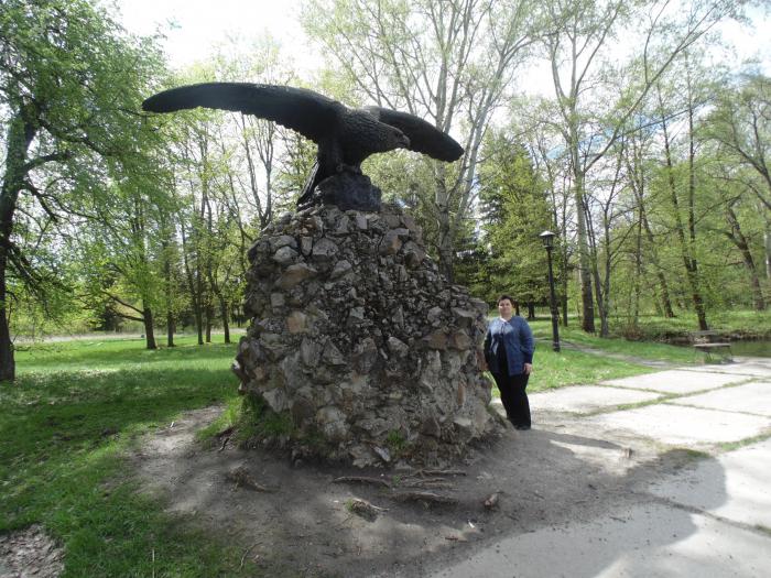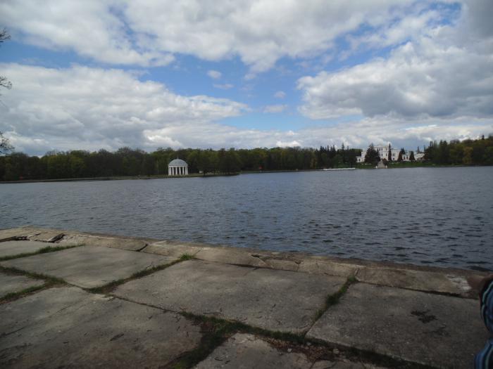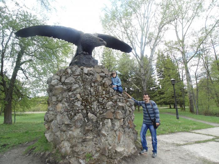 Перед Дворцом озеро, надо обойти вокруг, на другом берегу беседка и памятник орлу.