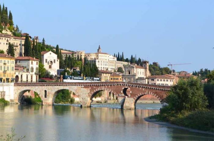 Пройдя еще немного по узким мощенным улочкам, прижимаясь к стенам домов, попадаешь на набережную реки Этч и переходу на левый берег по мосту Ponte Pietra. Мост построен в первом веке до н.э. над естественным бродом. В течении столетий неоднократно разрушался и восстанавливался в соответствии с веяниями моды и архитектуры тех исторических периодов
