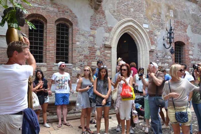 Огромное количество туристов, с которыми мы слились, гуляли по улицам, мы и не сразу поняли, что находимся в двух шагах от входа во внутренний дворик, смутило большое количество сувенирных лавочек с символикой любви – сердечки, замочки. Кругом везде упоминается известная влюбленная пара — Romeo и Giulietta. Так и есть на самом деле, — все перемешалось между действительностью и легендой.