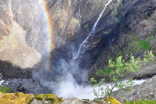 К 10 часам оказались на очередной паромной переправе (139NOK: 80 – машина с водителем, 29 – взрослый и 15 за детей). Переплыв на другой берег за 15 минут, мы быстро доехали до водопада. Когда подъехали к водопаду — распогодилось. Оставили машину на стоянке (здесь она была бесплатная), и пошли по пешеходной тропе. На входе висело предупреждение, что здесь опасно, и все ходят под свою ответственность. Водопад поразил скорее не своей мощью, а глубиной пропасти, куда он низвергается – общая высота падения около 180м, высота вертикального падения около 140м. Стоять на смотровой площадке и смотреть вниз было страшно и, только подойдя очень близко к краю, было видно дно ущелья.