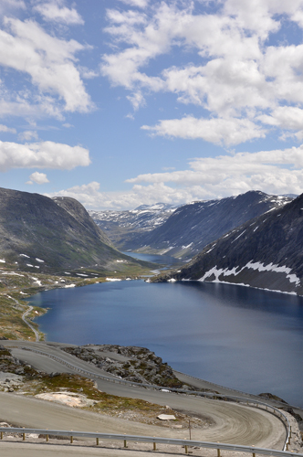 На подъезде к городку Dombas увидели снежные шапки на вершинах гор. Пейзажи завораживали. К 14-30 температура за бортом опустилась до +10 градусов и прошел дождь. К 16 часам мы достигли подножия Дороги Троллей. Пробег уже перевалил за 2000. Начали подъем по Лестнице Троллей — узкой дороге в гору с 11 поворотами на 180 градусов (по одной полосе в каждом направлении). Разъехаться с кэмперами или туристическими автобусами на этой дороге проблематично. Нам пришлось потолкаться в пробке, поджидая, пока наверху разъедутся автобусы (похоже, мы попали в туристическое время). Сам подъем по такой дороге захватывает дух. Также поднимаясь, можно понаблюдать за водопадом высотой около 180м — на середине дороги проезжаешь мост через него.
