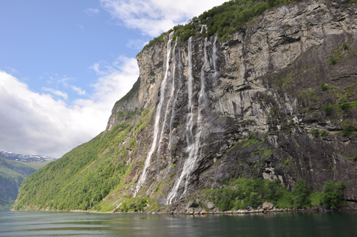 Выехали с парома, взобрались в горы, потом спустились опять в долину. Погода менялась несколько раз на дню вместе с рельефом местности – то тучи и влажно, то солнце. В Финляндии нас в свое время очень поразили дороги, как будто прорубленные в скалах. Т.е. если на пути дорожного полотна встречается гора, то гора в этом месте убирается и полотно продолжается как небывало в окружении скал. Здесь, в Норвегии, таких дорог очень много. В 19-30 были на месте второй стоянки – кэмпинг Geiranger в одноименном городке и на берегу одноименного же фьорда (за двухдневную стоянку с палаткой отдали 460NOK). Вокруг была красота неописуемая: кэмпинг расположен в долине, по бокам — горы, в верховьях долины – водопад, перетекающий в горную рек, впадающую во фьорд. Вода в реке чистейшая – видно дно, но безумно холодная. Если опустить руки, то они стынут уже через несколько секунд. Температура воды не превышает 10 градусов. Даже если только подойти к мостику через эту реку, то сразу обдает холодом.